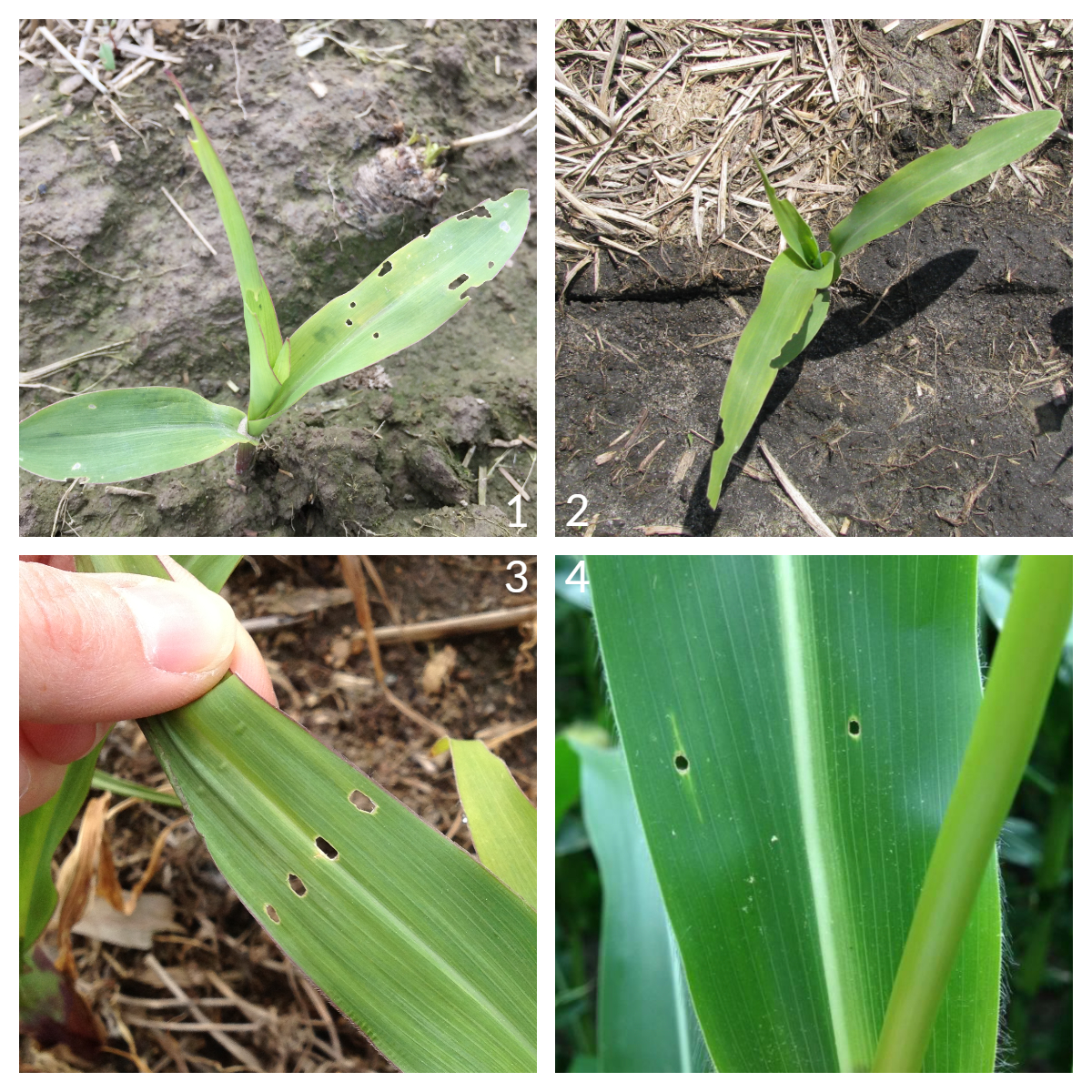 1. Dommages de larve de ver-gris noir; 2. Dommages de larve de légionnaire uniponctuée