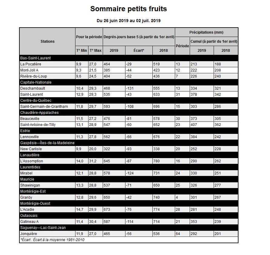 | Estrie, Centre-du-Québec et Mauricie | Début fruits verts | + 50 cm | + 50 cm | Floraison à début fruits verts |