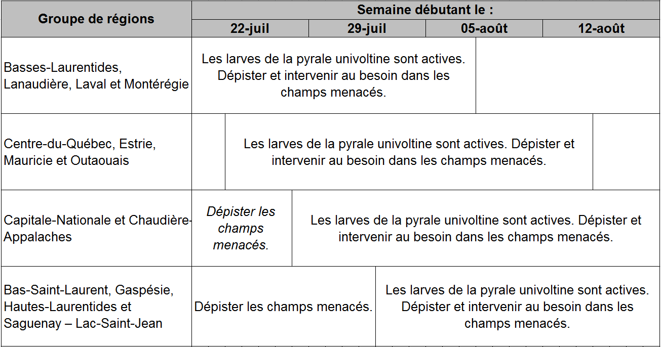 Bas-Saint-Laurent, Gaspésie, Hautes-Laurentides et Saguenay–Lac-Saint-Jean : Une première capture de pyrale univoltine a été réalisée au Saguenay, le 22 juillet dernier. Selon cette capture et le cumul des degrés-jours de croissance, les premières pontes pourraient débuter vers le 28 juillet. Ainsi, les premières larves pourraient être observées vers le 2 août, dans ces régions. À partir de la date indiquée pour l’apparition des masses d’œufs (28 juillet), il est possible de visiter les champs pour déterminer le taux de parasitisme par les trichogrammes, s’il y a lieu. À partir de la date indiquée pour l’apparition des premières larves (2 août), visitez les champs menacés à intervalles réguliers. À cette période, les premières masses d’œufs auront éclos, et les jeunes larves auront commencé à cribler les jeunes plants de trous minuscules. Cet avertissement présente, ci-dessous, les dates d’intervention recommandées (approximatives) dans ces régions pour les stratégies de 1 à 3 traitements appliqués sur des champs qui atteignent le stade 6 feuilles ou plus durant la période de ponte de la pyrale univoltine.