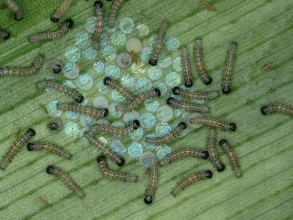 La ponte étant étalée dans le temps, le dépistage des masses d’œufs et des jeunes larves devrait débuter juste avant l’émergence des panicules dans les champs à risque et se prolonger durant les deux à trois semaines suivant la sortie des croix. Pendant cette période, il est recommandé de dépister les champs à risque tous les 5 à 7 jours. Le dépistage consiste à noter le nombre de plants porteurs de masses d’œufs et les larves, au minimum à 10 endroits différents par champ, en examinant le feuillage de 10 plants consécutifs sur le même rang, pour un total de 100 plants examinés par champ (cliquez ici pour accéder au schéma d'échantillonnage).