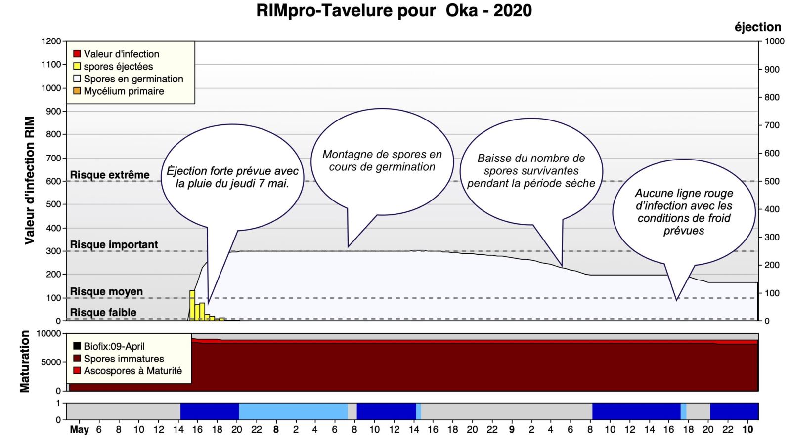 La pluie prévue jeudi risque de mener à un « tir à blanc » : la pluie de jour donnera lieu à une éjection (en jaune) assez forte et une accumulation élevée de spores sur les feuilles (montagne blanche), mais aucune infection n’est prévue. Le froid annoncé pour les prochains jours ralentit la maturation et l’éjection et allonge le temps requis pour l’infection.