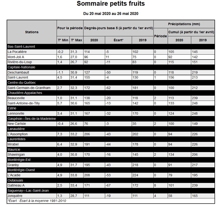 Du froid historique à une chaleur accablante. Le stade des framboisiers en province. Plusieurs insectes et des tétranyques sont observés. Quelques maladies rapportées. Désherbage mécanique en cours.
