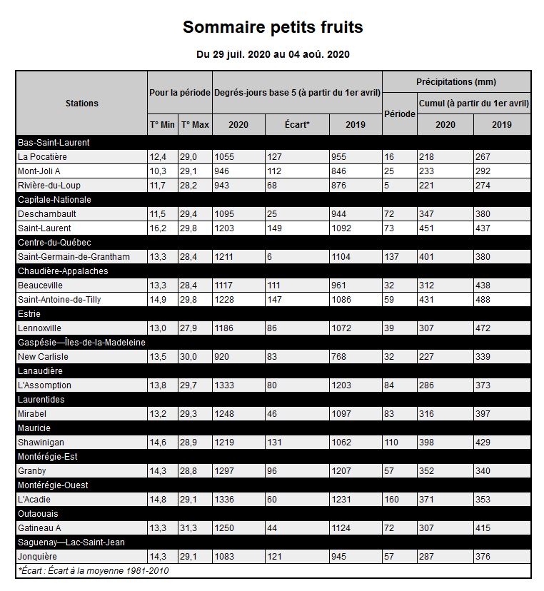 sommaire agrométéorologique. Bien que la récolte de framboises d'été en champ soit encore en cours par endroits, pour certaines régions, la cueillette de champ est déjà terminée. Toutefois, la récolte se poursuit dans les cultivars d'automne et la framboise en hors-sol, programmée ou non. Le modèle bioclimatique sur la