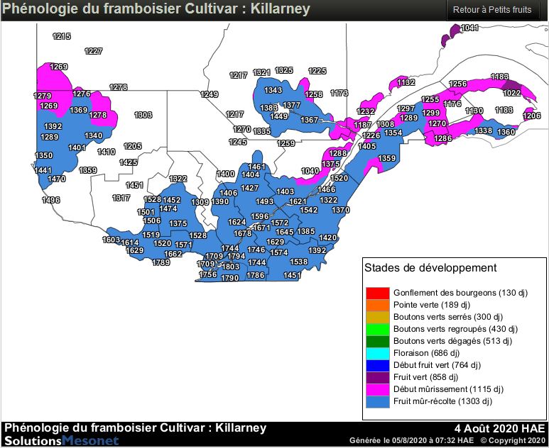 phénologie du framboisier pour le cultivar Killarney demeure disponible sur le site Agrométéo Québec.