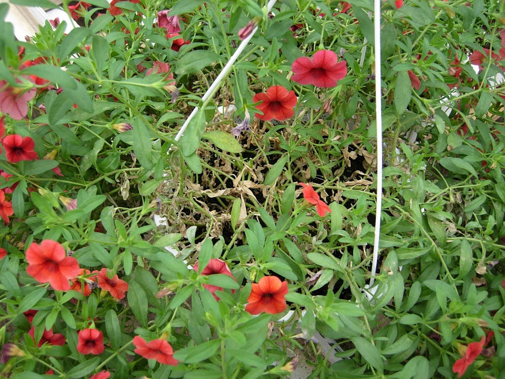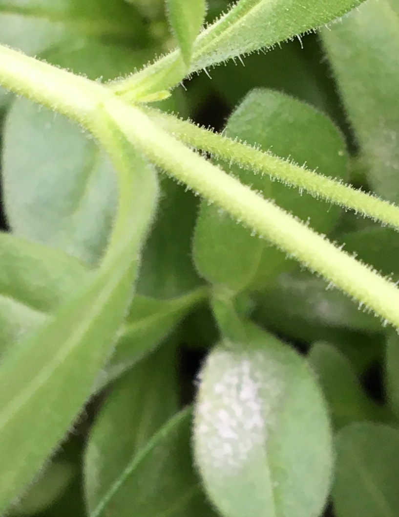 Nos collaborateurs rapportent plusieurs cas de blanc observés sur des plants de calibrachoas, particulièrement de variétés rouges et orangées. Le premier symptôme sur les feuilles, soit la poudre blanche, typique du blanc, est parfois difficile à repérer. Les plants dépérissent à l’intérieur du feuillage, par exemple, au centre d’un panier suspendu. Les feuilles du bas jaunissent, se dessèchent, brunissent et tombent.