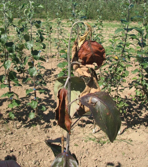 D’autre part, pour qu’il y ait infection, de l’eau doit être présente sur la fleur. Même s’il ne pleut pas, l’irrigation par aspersion, une pulvérisation foliaire ou la rosée peuvent suffire à déclencher l’infection. Il faut donc éviter de mouiller les arbres pendant la floraison.