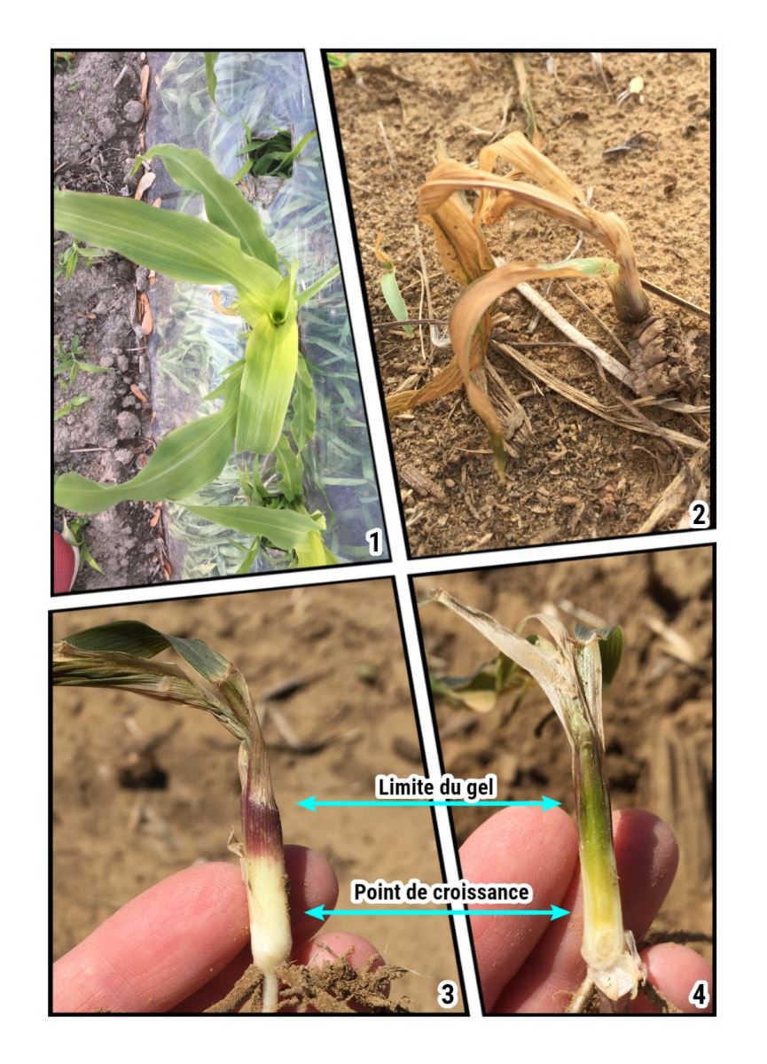2, 3 et 4 : Dommages par le gel et positionnement du point de croissance du maïs
