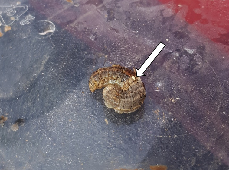 Lors d’un dépistage, il est intéressant de porter attention à l’état de santé des larves (si elles sont amorphes ou noircies) et à la présence d’ennemis naturels. Il est notamment possible de voir des œufs de mouche tachinaire pondus sur les larves. Une étude au Centre de recherche sur les grains (CÉROM) est en cours pour évaluer la prévalence des ennemis naturels dans les populations de ver-gris moissonneur.