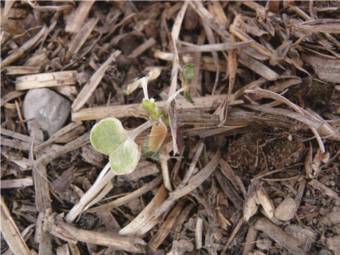 Le canola, comme le soya, a son point de croissance exposé dès la sortie du plant. Bien qu’il soit plus tolérant au froid que le soya. Pour le canola, les plantules se remettent généralement bien des gels printaniers s’ils sont légers et que les points végétatifs ne sont pas endommagés. Le canola tolère mieux le gel au stade de 3-4 feuilles qu’au stade des cotylédons. Avant d’évaluer les dommages, il faut attendre 4 à 5 jours après le gel. Le point végétatif doit alors être examiné et si le stade du canola est avancé, il faut vérifier s’il y a du vert au centre des rosettes. Même si les cotylédons et les autres feuilles sont noirs, si le point végétatif n’a pas été atteint par le gel, une repousse peut avoir lieu 4 à 10 jours après le gel, selon les conditions météorologiques. La photo 2 montre de nouvelles pousses sur une plantule de canola touchée par le gel mais dont le point végétatif est intact.