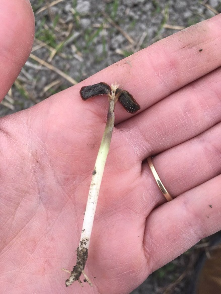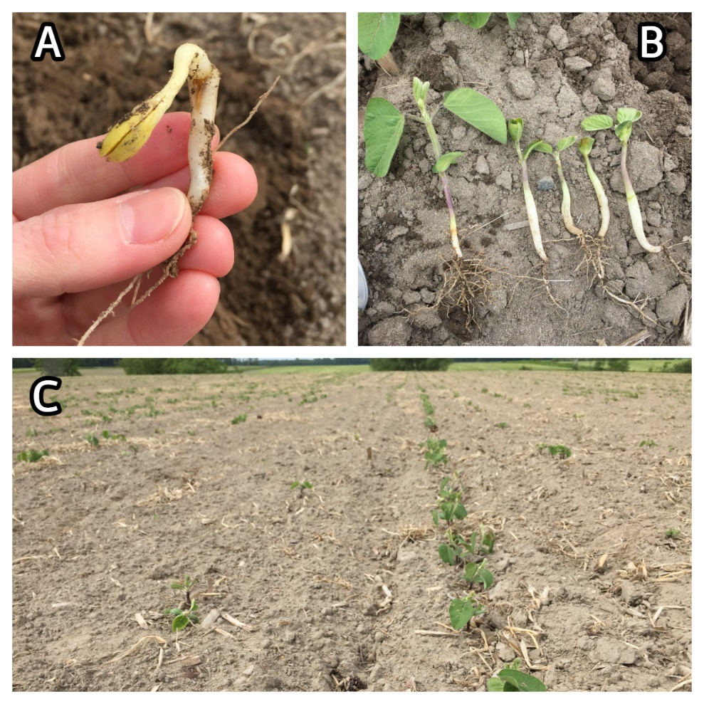 Les causes de mauvaise levée dans un champ sont souvent multiples. Cette année par exemple, des problèmes ont été constatés en lien avec le temps froid et sec pendant la période des semis. La levée a été lente dans certains champs, ce qui peut être aggravé lorsque la profondeur de semis est inadéquate. D’autres causes peuvent s’ajouter, telles que des ravageurs des semis (vers fil-de-fer, mouche des semis, vers blancs, etc.), certaines conditions météorologiques (gel, abrasion par le sable, etc.), des dommages d’herbicides, la compaction, etc. La figure 2 présente quelques exemples pour le maïs. La figure 3 présente des plantules de soya avec une émergence retardée due à un semis trop profond en conditions froides et sèches.