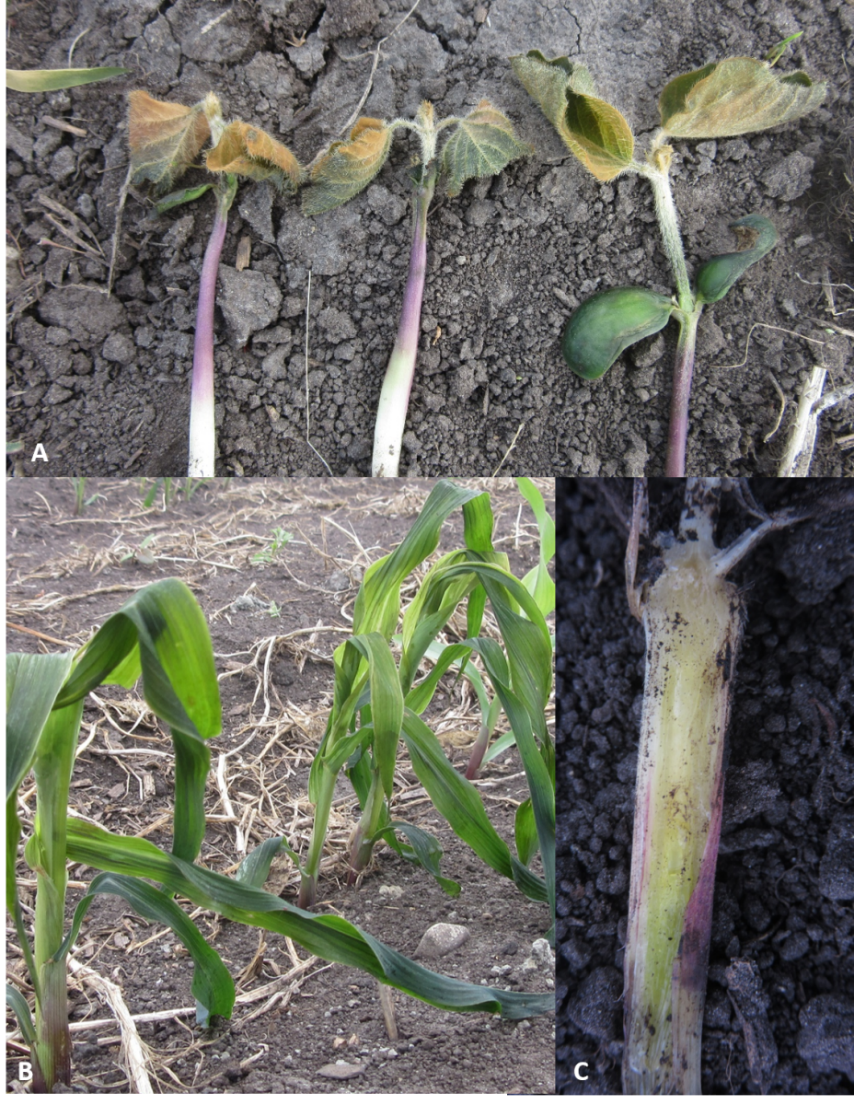 Premièrement, observez la distribution du problème à l’échelle du champ. Par exemple, des manques à la levée qui se situent surtout sur certains rangs peuvent indiquer que la cause est non parasitaire, comme un problème lié à l’équipement de semis. Des plants affectés par zones distribuées aléatoirement peuvent indiquer que la cause est parasitaire, par exemple des dommages de certains insectes. Deuxièmement, déterrez des plants atteints (non émergés, rabougris, flétris, coupés, retard de croissance, coloration anormale, etc.) en les soulevant délicatement avec une pelle à jardin. Examinez le grain, les racines, la tige et le sol autour du plant. Ceci permettra de voir s’il y a des pourritures, des grignotements d’insectes, des plants semés trop profondément ou trop près de la surface, etc. Il est utile également de comparer des plants atteints à des plants sains.