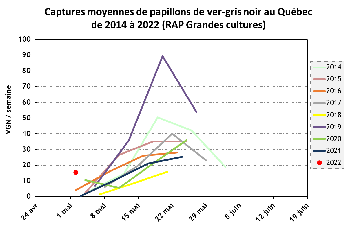 Des papillons de ver-gris noir ont été capturés dans la majorité des pièges installés à travers la province (données disponibles ici). Depuis 2014, il s’agit des captures les plus élevées pour cette espèce en début de saison.