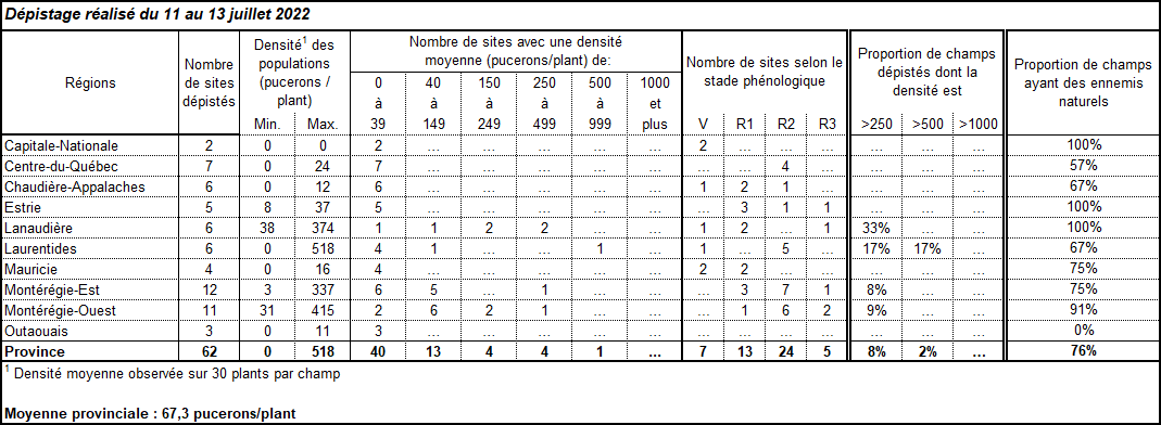 En plus de la quantité de pucerons, le niveau de stress subi par la culture et la présence d’ennemis naturels sont des éléments à prendre en compte pour juger de la pertinence d’un traitement. Certains cultivars tolèrent beaucoup mieux la présence de pucerons que d’autres. Pour en savoir plus sur la stratégie d’intervention recommandée au Québec contre le puceron du soya, consultez l’avertissement Nº 13 du 8 juillet 2022 et cette vidéo, qui explique la manière de dépister.