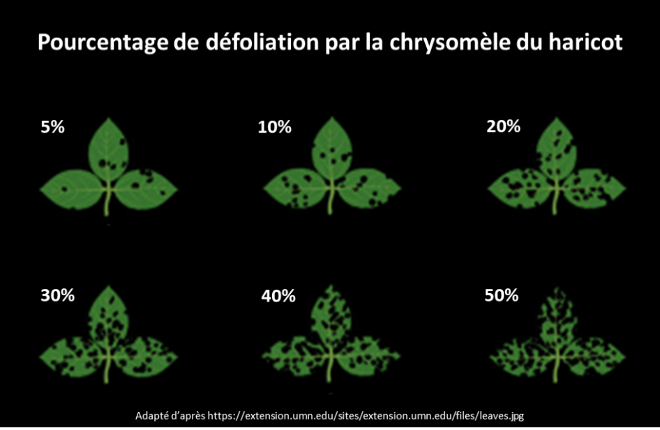 L’évaluation des dommages se fait en estimant le pourcentage de défoliation sur 5 plants dans 10 stations choisies au hasard dans le champ, pour un total de 50 plants. Sur chaque plant, prélever une feuille trifoliée dans le milieu du feuillage et la comparer à l’image de référence ci-dessous. Il est également possible d’utiliser des applications pour téléphones intelligents qui estiment le pourcentage de défoliation (BioLeaf pour Android et LeafByte pour Apple). Finalement, faire la moyenne de toutes les feuilles trifoliées examinées.