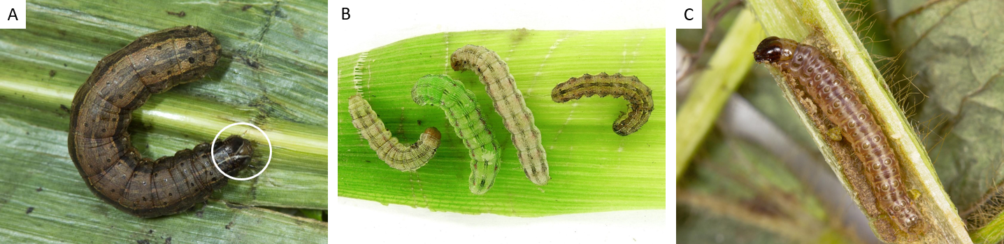 Légionnaire d’automne (A); Ver de l’épi du maïs (B); Pyrale du maïs (C)