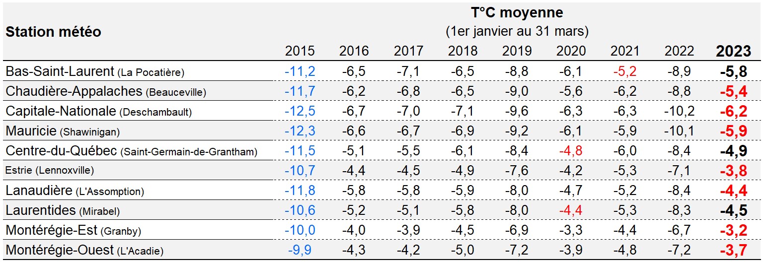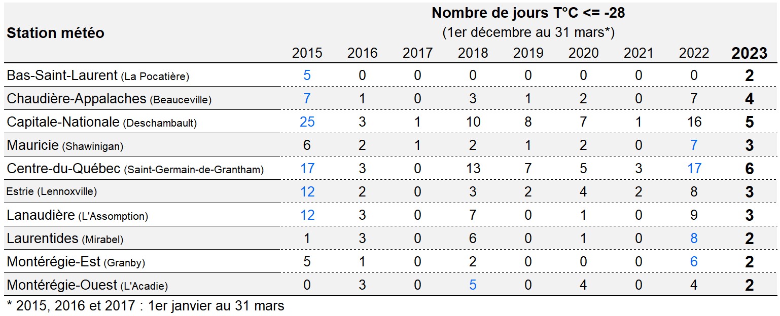 Jusqu'à maintenant, très peu de dommages hivernaux sont rapportés aux tiges et aux bourgeons à fruits. Le portrait de la situation demeure cependant préliminaire et sera confirmé plus précisément au cours des prochaines semaines. Pour l'instant, les statistiques météorologiques nous indiquent que le dernier hiver fut en moyenne parmi les plus chauds des dernières années. Cependant, si vous observez des dommages, ils sont possiblement survenus entre la fin janvier et le début de février, alors que le mercure est descendu sous les -30°C durant quelques jours et à plusieurs endroits. Voici quelques compilations météorologiques des hivers passés :