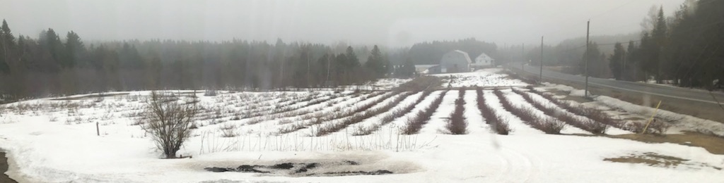 Les bleuetières du sud-ouest du Québec sont exemptes de neige depuis pratiquement la fin mars. Ailleurs, la chaleur et la pluie récentes ont rapidement fait disparaître ce qui restait du couvert de neige, sauf dans quelques bleuetières plus froides de l'est de la province (photo ci-haut). La taille est en cours dans la majorité des bleuetières et l'éclatement des bourgeons à fruits est déjà observé en Montérégie. En moyenne, le débourrement des plants semble légèrement plus hâtif comparativement à l'an dernier. Vous pouvez consulter les données récentes de température, de précipitations et de chaleur accumulée (DJ5) de la dernière semaine dans le