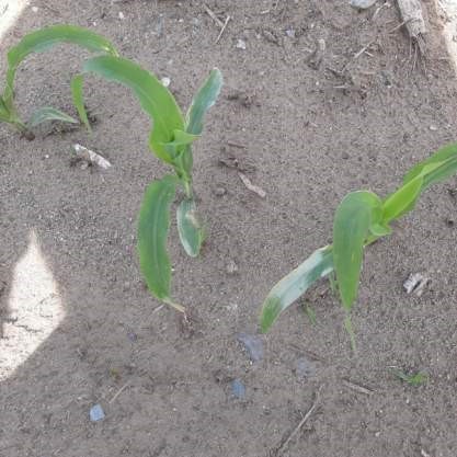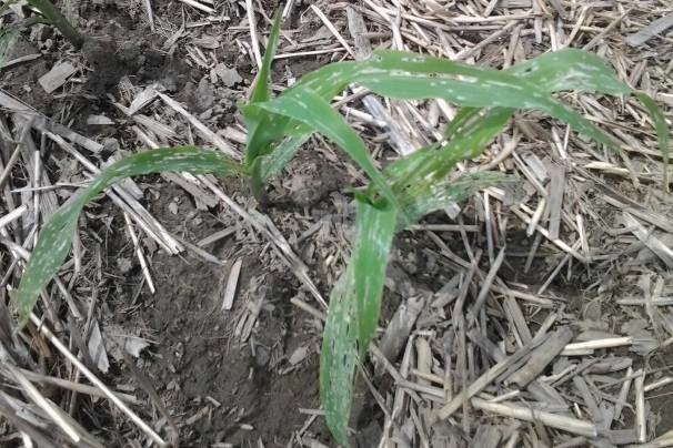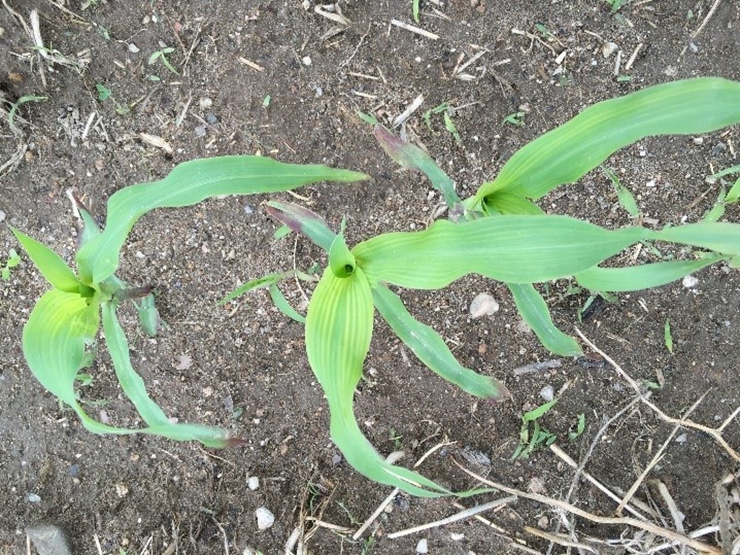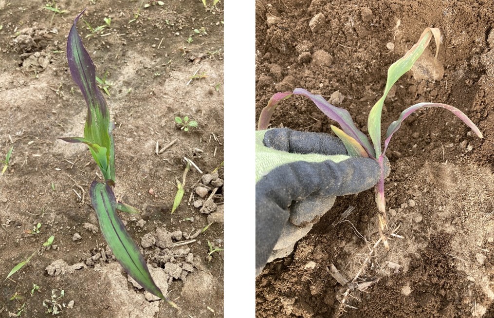 - Feuilles mauves : Souvent, les plants de maïs prennent cette couleur lorsqu’il y a une mauvaise translocation des sucres (accumulation de pigments). Certains hybrides sont plus susceptibles de présenter cette coloration. Cela peut être causé par des conditions fraîches (air et sol) et humides, un sol compact ou un lit de semence peu profond, empêchant le développement normal du plant. Certains insectes s’alimentant des racines, ou tout autre dommage racinaire, peuvent également entraîner cette coloration.