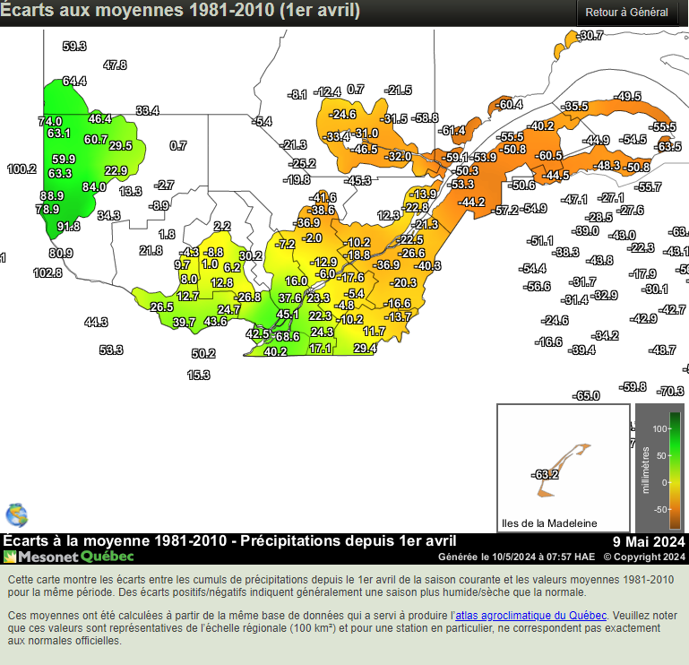 Un printemps hâtif en mars a été suivi par du temps bien variable par la suite en avril et au début mai, avec entre autres plusieurs nuits froides. Malgré cela, le cumul des degrés-jours (base 5) pour 2024 dépasse partout la moyenne de référence. Quant aux précipitations depuis le 1er avril, le total reçu surpasse la moyenne pour les secteurs sud et ouest, mais demeure sous la moyenne pour les secteurs centre et est. Cela a comme conséquence des conditions de sol qui varient passablement selon la région, ce qui influence l’avancement des semis.
