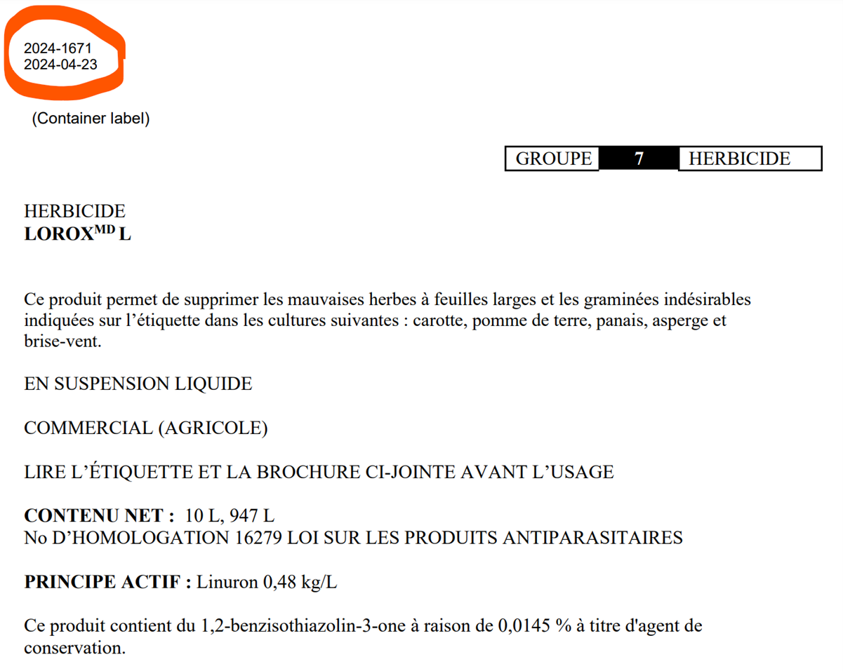 C’est la période pour déterminer la ou les méthodes de contrôle des mauvaises herbes pour la saison 2024. En plus du contrôle mécanique possible avant la levée et jusqu’en postlevée tardive, des applications de désherbants en prélevée de la culture sont habituellement nécessaires. Avant leur utilisation, il est important de bien lire l’étiquette du ou des produits choisis pour vérifier si des changements ont été apportés pour leur usage respectif. Si une mise à jour de l'étiquette a été faite, l’information apparait en haut dans le coin gauche de la première page (ex. : 2024-04-23 pour le LOROX L, soit le 23 avril 2024, donc récemment dans ce cas).