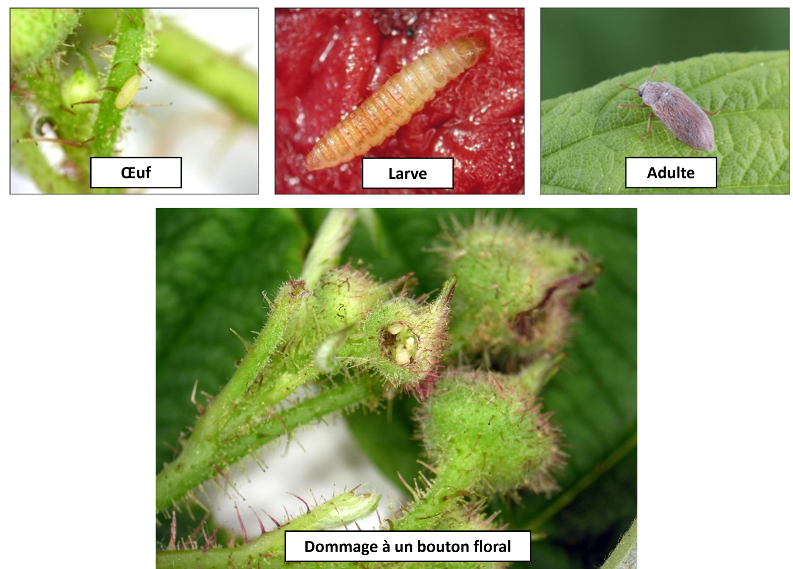 Différents stades de développement du byture et ses dommages sur un bouton floral