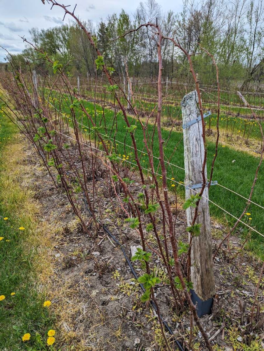 chilling) est l'une des causes les plus souvent rapportées dans la littérature pour le débourrement inégal et erratique des cannes. Cela n'est généralement pas un problème en champ au Québec, mais les conditions de l'hiver dernier ont été inhabituelles. Il est également possible qu'une perte de dormance pendant l'hiver suivie d'un retour du froid puisse avoir endommagé les tissus vasculaires, sans causer la mort totale de la canne.
