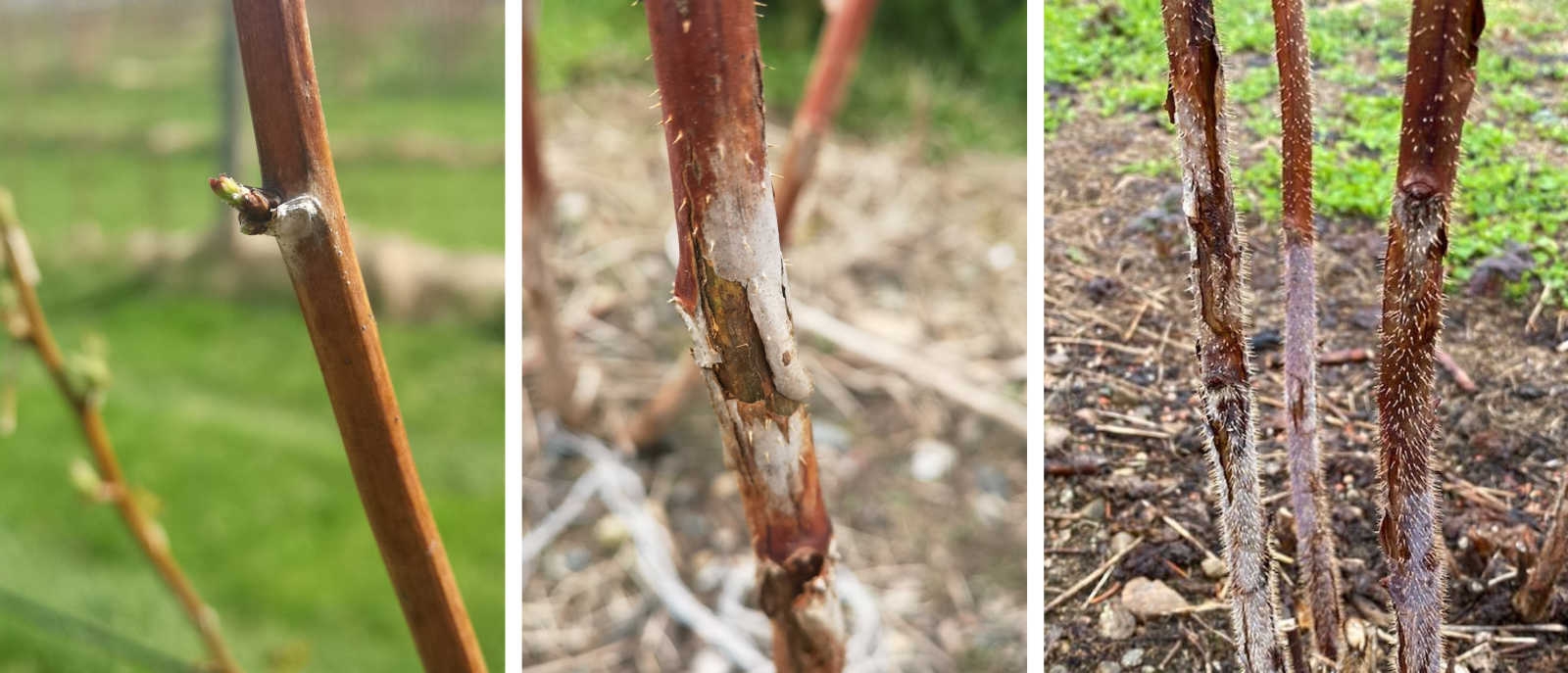 brûlure des dards. Les bourgeons infectés restent petits, fanent ou ne débourrent pas. Ils sont également plus sensibles au gel hivernal. Cette maladie affecte l’écorce superficiellement et les tissus vasculaires sous-jacents restent intacts, d'où le débourrement possible des autres bourgeons non infectés sur la canne. À noter que les symptômes observés en ce moment proviennent d'une infection ayant eu lieu l'année précédente et en conditions très pluvieuses, cette maladie peut détruire une grande partie des bourgeons sur la tige. Il est donc important de rester vigilant pour protéger les nouvelles tiges cette année. D'autres maladies pourraient affecter le développement des tiges, notamment le