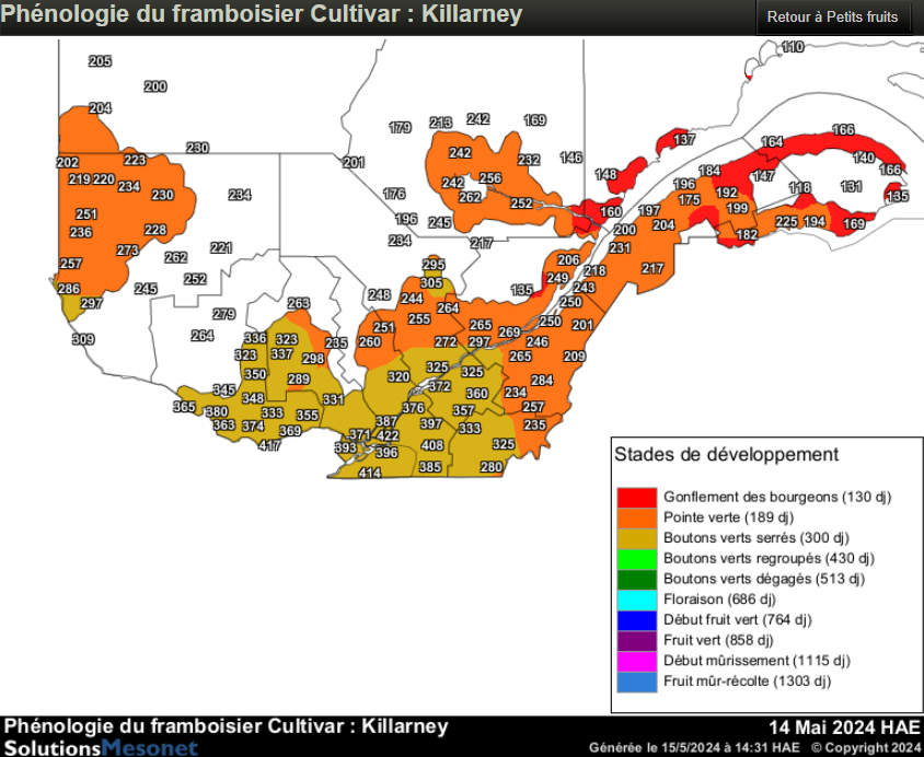Météo en bref. Stade de développement : pointe verte à boutons verts dégagés. Débourrement inégal en champ. Brûlure des dards répandue. Pourridié des racines sur les sites avec historique. Faible présence de punaises et de bytures. Présence variable d'anthonomes et de tétranyques. Savoir reconnaître les prédateurs des tétranyques.