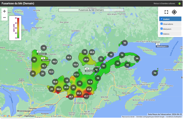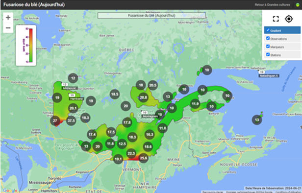 La majorité des champs de blé d’automne ont dépassé le stade de la floraison, tandis que certains champs de blé de printemps sont sur le point d’atteindre ce stade. Avec les températures élevées et la pluie annoncée dans les prochains jours, il faut rester vigilant pour les champs approchant les stades de la pré-floraison et de la floraison en ce qui concerne la fusariose de l’épi. Consultez les cartes interactives d’Agrométéo Québec afin de connaître le niveau de risque pour les différentes régions (voir les cartes ci-dessous en date du 21 juin). Pour de plus amples informations sur les facteurs de risque et la stratégie d’intervention, consultez l’avertissement N° 7 du 14 juin 2024.