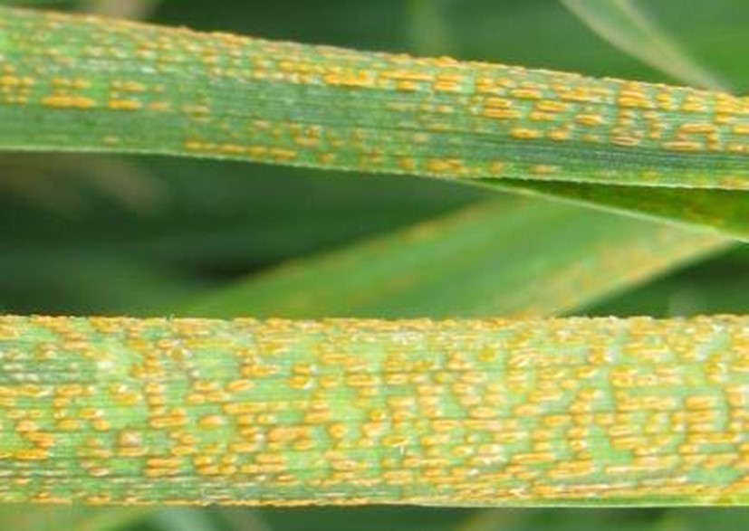 La rouille jaune se présente sur les feuilles du blé par des pustules (lésions surélevées) jaune à orange de forme allongée disposées en lignes parallèles entre les veines de la feuille (photo). Un faible niveau d’infestation peut produire des conséquences importantes sur les rendements, surtout lorsque la feuille étendard est atteinte.