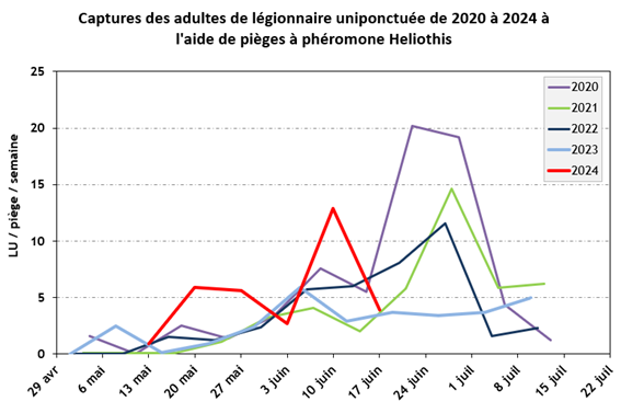 Le graphique ci-dessous montre l’évolution des captures moyennes de papillons de légionnaire uniponctuée pour la province en 2024. Au Québec, la légionnaire uniponctuée peut causer des dommages importants de façon sporadique. La dernière année où plusieurs champs ont été affectés par les larves de cet insecte remonte à 2017.