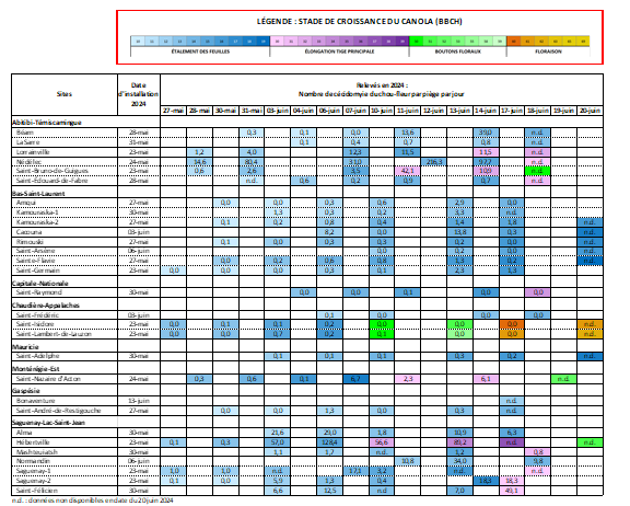 Les résultats des captures d’adultes de la cécidomyie du chou-fleur en date du 20 juin montrent que la majorité des sites ont des populations faibles. Pour certains sites situés en Abitibi-Témiscamingue et au Saguenay–Lac-Saint-Jean, les populations sont plus élevées. Cependant, les conditions météorologiques actuelles favorisent la croissance rapide des plants de canola, contribuant à l’atteinte de stades moins sensibles à la cécidomyie du chou-fleur. Les données de piégeage sont accessibles ici.