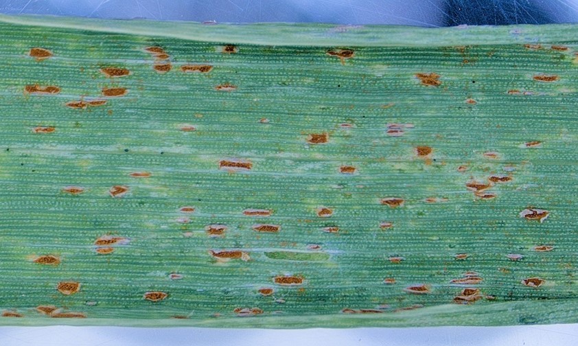 | Rouille brune (Puccinia triticina f. sp. tritici) | Petites pustules, brunes à oranges de forme ronde à ovale, disposées de façon aléatoire sur la face supérieure (haut) des feuilles. | |