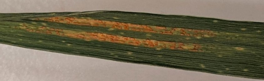 | Rouille jaune (Puccinia striiformis f. sp. tritici) | Petites pustules jaunes à oranges, de forme allongée et disposées en lignes parallèles entre les veines sur la face supérieure (haut) de la feuille. |