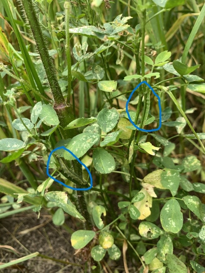 Il y a eu des signalements au RAP Grandes cultures de dommages liés au ver-gris tacheté dans la luzerne (voir photo ci-dessous) au Bas-Saint-Laurent. Des validations sont en cours afin de confirmer le ravageur puisqu’habituellement, cet insecte s’attaque très peu à la luzerne.