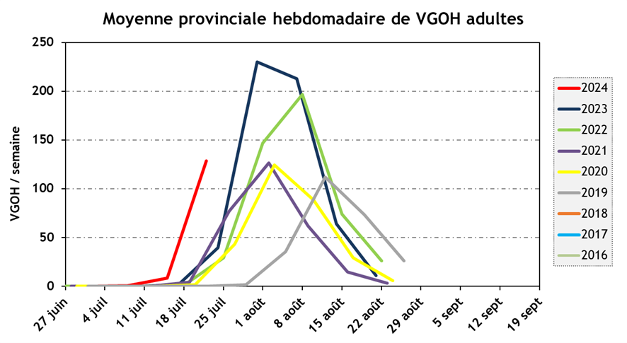 Au cours de la dernière semaine, des papillons de VGOH ont été capturés dans toutes les régions. Les captures ont fortement augmenté dans la quasi-totalité des pièges suivis par le RAP Grandes cultures, avec une avance par rapport aux années précédentes.