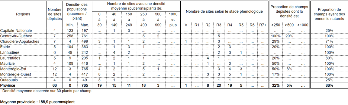 Pour les champs qui atteignent le seuil d’alerte et qui sont encore à un stade sensible (R1 à R4), il est recommandé d’augmenter la fréquence des dépistages aux 3 à 7 jours pour suivre l’évolution des populations de pucerons et d’ennemis naturels, le stade physiologique du soya ainsi que le stress causé aux plants. Si les populations augmentent de plus de 35 % lors de ces dépistages, il est possible de considérer un traitement insecticide foliaire. Dans ce cas, il est important de se référer à la Stratégie d’intervention recommandée au Québec contre le puceron du soya.