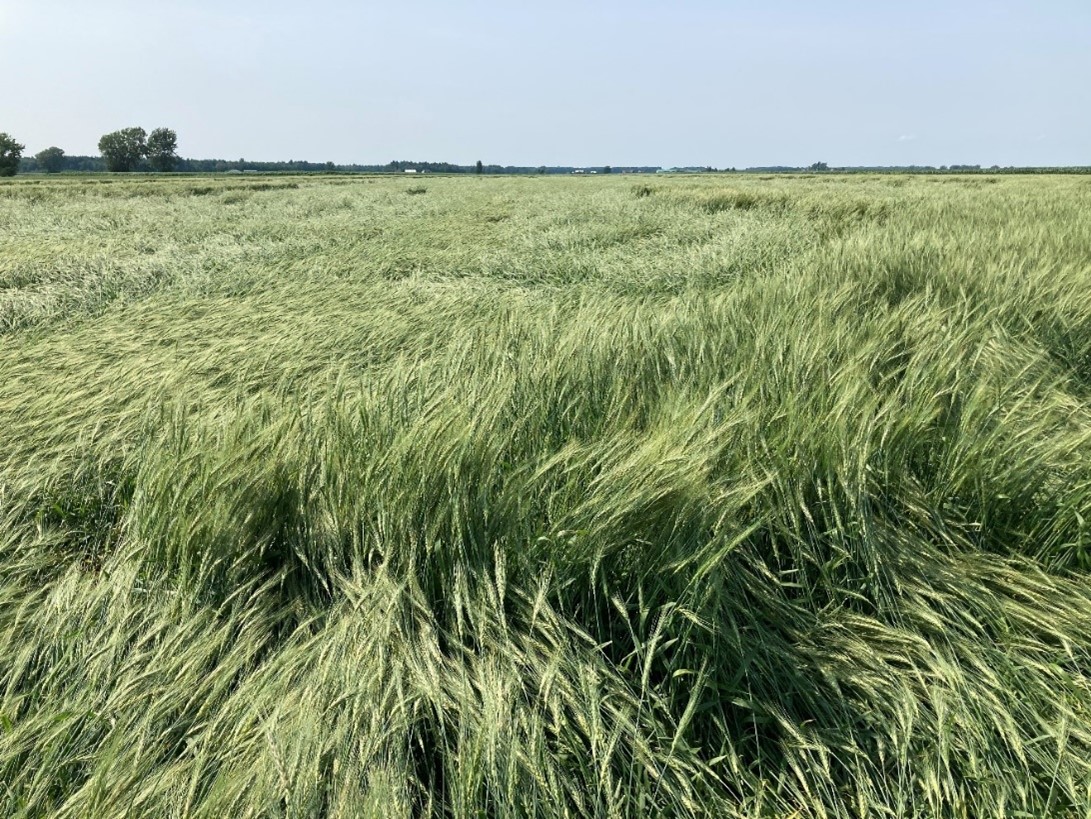 De plus, à l’intérieur de la canopée, la végétation couchée demeure plus humide et contribue à la perte de qualité du grain. Les risques de germination des grains sur l’épi et de développement de moisissures augmentent. Dans le cas de la fusariose de l’épi, que les conditions aient été favorables ou non à l’infection lors de la floraison, des champignons pourront se développer, contribuant ainsi à augmenter les teneurs en mycotoxines dans les grains. L'application d'un fongicide à ce stade serait inutile puisque le produit ne parviendrait pas à atteindre l’ensemble de la canopée ainsi que les épis. Les délais d’application avant la récolte, inscrits à l’étiquette des produits, doivent également être pris en compte.