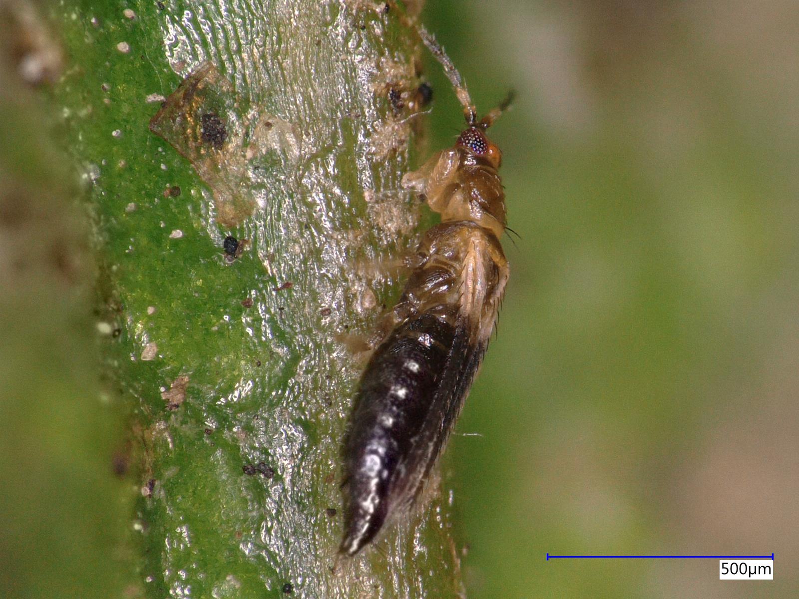 Cet acarien de couleur jaune blanchâtre est plus petit (0,36 mm) que le tétranyque à deux points (0,5 mm). Il a plusieurs petits points noirs de chaque côté du corps. Il s’installe et se nourrit à la face inférieure des feuilles.