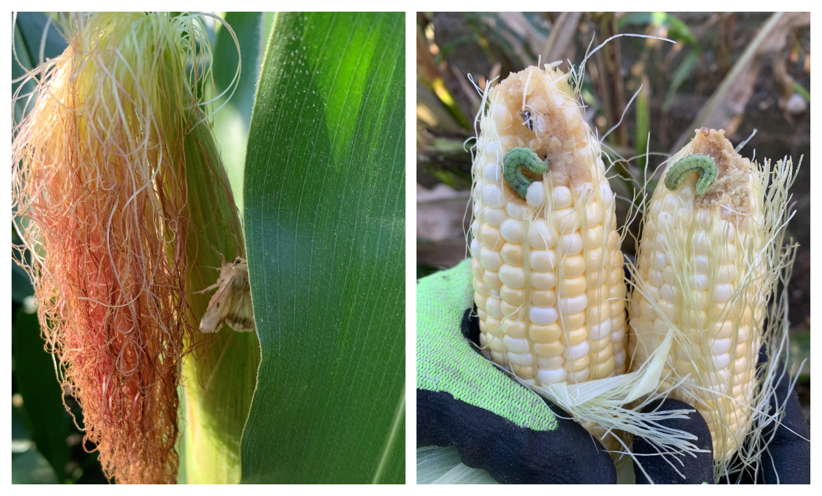 Le nombre de captures de papillons de légionnaire d’automne est en hausse. Cependant, peu de dommages au champ sont rapportés. Les captures du ver-gris occidental des haricots (VGOH) sont encore à la baisse dans toutes les régions et aucune nouvelle masse d’œufs ou de jeunes larves n'est rapportée ainsi qu'aucun dommage à la récolte. Quant à la pyrale du maïs, les captures de la 2e génération de la bivoltine se poursuivent sur 5 sites. Les populations demeurent faibles et peu de masses d’œufs sont observées au champ. Des cas de rouille et de charbon commun sont rapportés dans quelques champs. Ces observations sont en légère croissance, mais demeurent à de très faibles niveaux. Des pucerons sont observés sur des croix et des épis, à des niveaux en baisse. Les prédateurs semblent offrir un contrôle intéressant et aucun traitement n’est prévu pour l’instant. Quelques symptômes mineurs de dessèchement (northern corn leaf blight) causé par le champignon Exserohilum turcicum sont aussi observés, mais à de faibles niveaux.