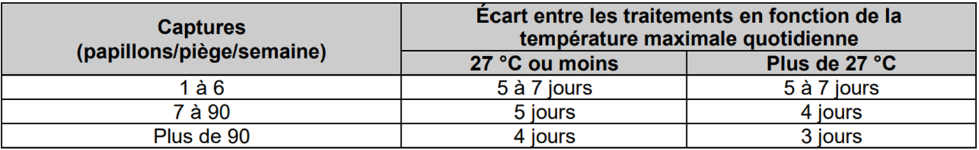 Ver de l’épi : augmentation des captures de papillons dans la dernière semaine; le piégeage des papillons est recommandé dans les champs à risque. Autres ravageurs et problèmes phytosanitaires : la situation demeure calme.Le tableau suivant, extrait de la fiche technique Le ver de l’épi du maïs, présente les intervalles de traitements en fonction du nombre de papillons capturés et des températures maximales journalières. La fréquence des pulvérisations est plus élevée par temps chaud, car certains insecticides (ex. : pyréthrinoïdes) se dégradent plus rapidement dans ces conditions. Également, le développement des larves et du maïs sucré est accéléré avec une augmentation des températures. Pour connaître les traitements homologués, cliquez ici.