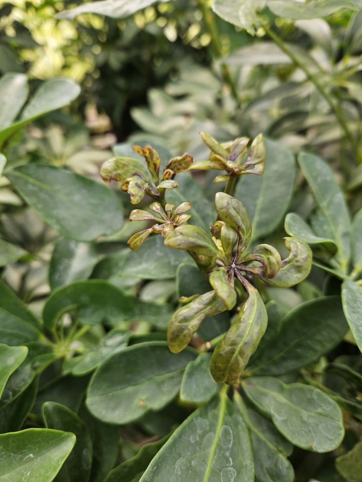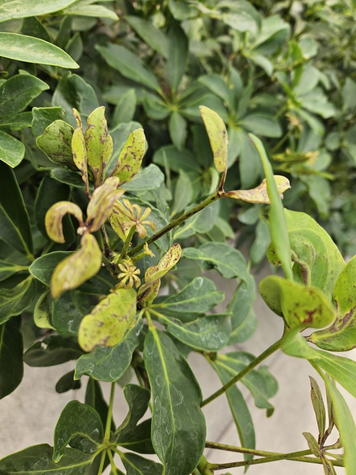 Dommages de Thrips parvispinus sur Schefflera sp.