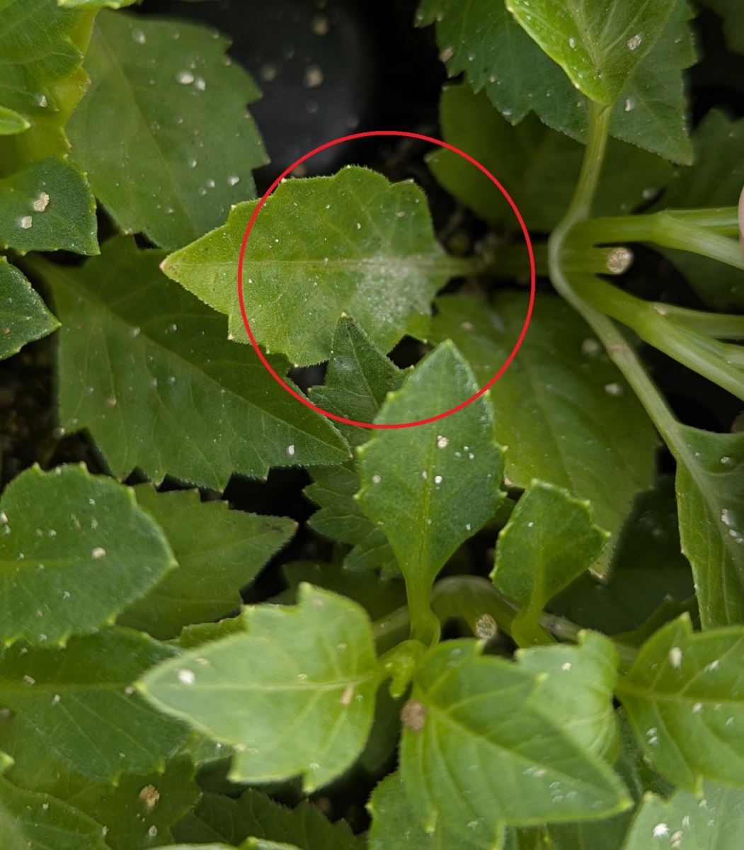 Blanc : La présence parfois importante de taches foliaires d’oïdium (blanc) a été observée dans des arrivages de Begonia Rieger, de Dahlia sp. et d’Helianthus.