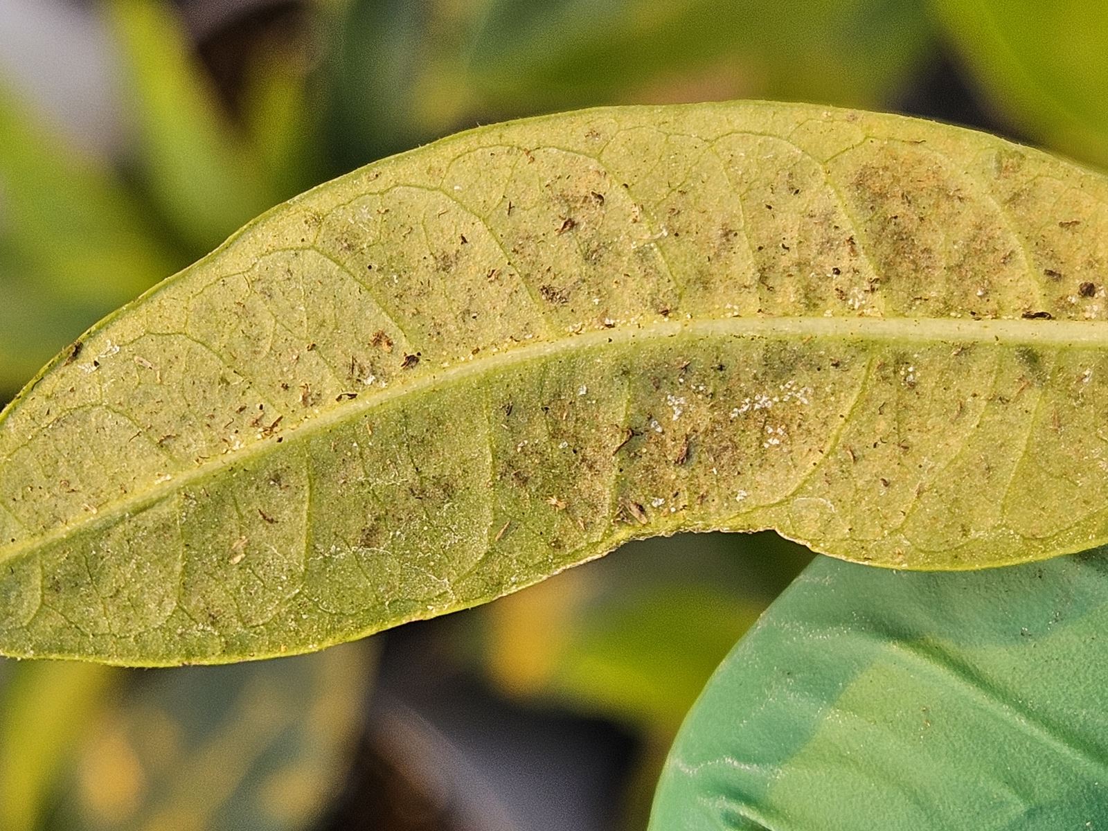 Dommages du tétranyque à deux points sur une feuille de Mandevilla