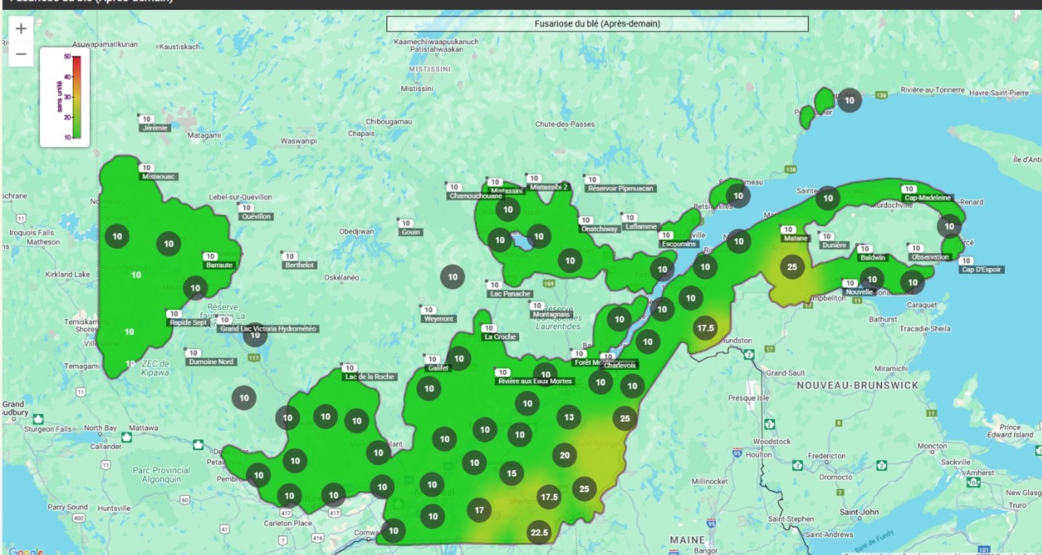 Il est important de noter que la maladie nécessite au moins 48 heures de conditions favorables pour se développer au champ. Il est donc essentiel de consulter les prévisions météorologiques à venir, et pas seulement les conditions du jour même.