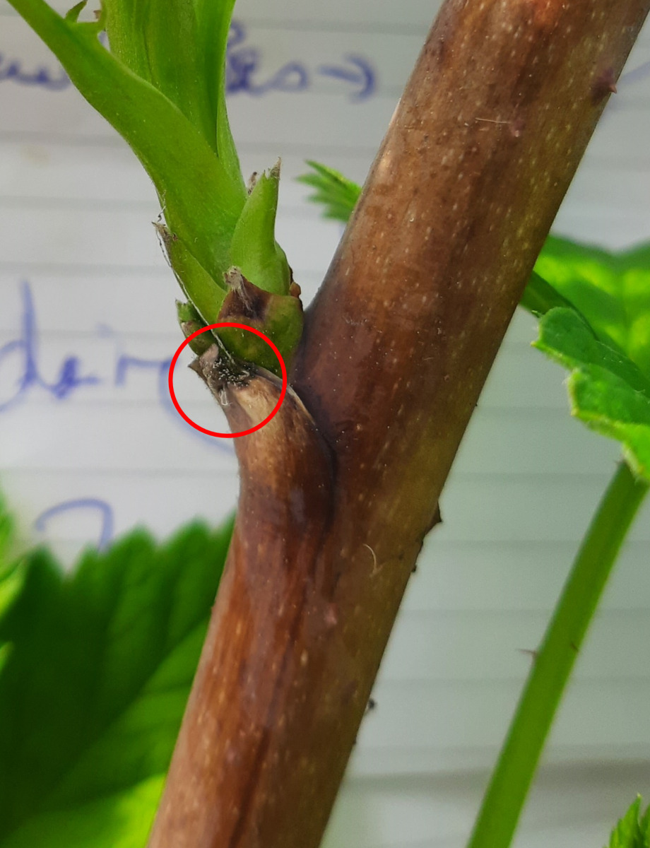 Sporulation de moisissure grise à l'aisselle d'un bourgeon (cicatrice foliaire), Tulameen sous tunnel, 26 mai 2025