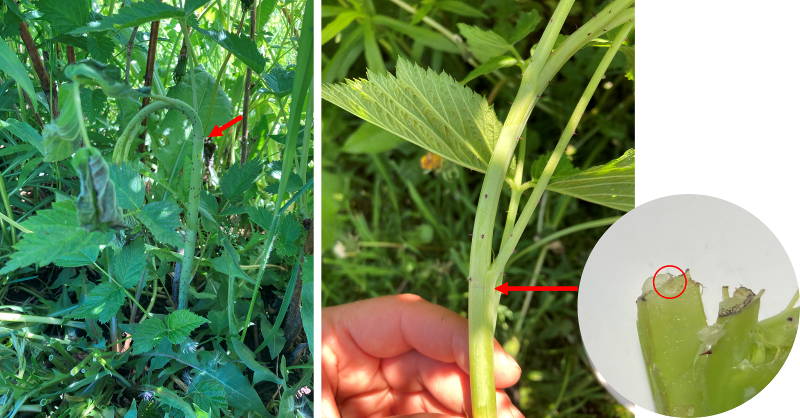 Symptômes sur de nouvelles tiges de l'année de la variété Prélude et larve de mouche du framboisier, 27 mai 2025