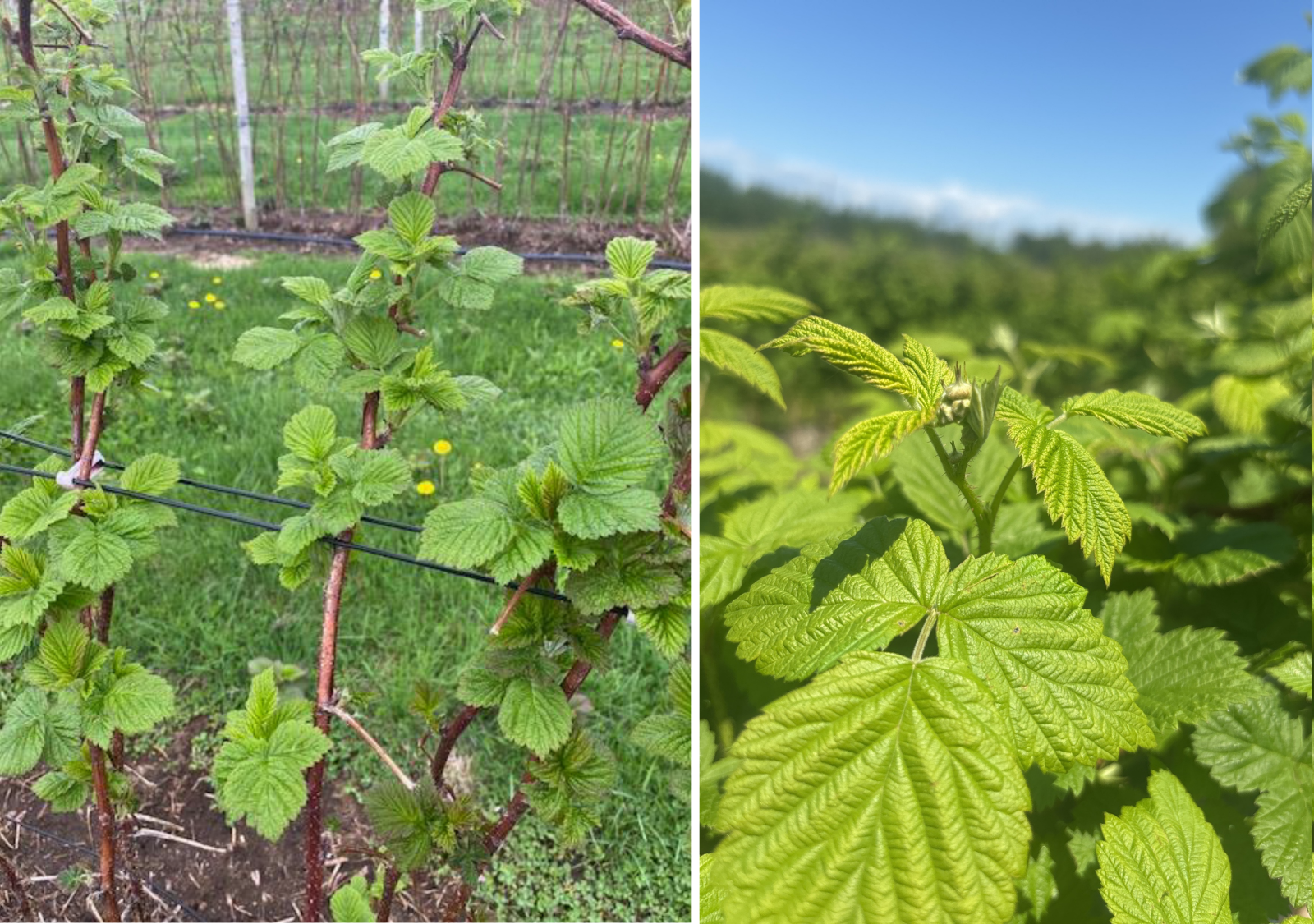 Les plants de la première sortie sont en majorité aux stades boutons verts serrés à boutons verts regroupés. Les sorties plus tardives sont au stade pointe verte. Certains plants à la régie hâtive sont en floraison. Le temps frais et pluvieux ayant limité le travail des pollinisateurs, notamment des abeilles domestiques, il est possible que la pollinisation n'ait pas été adéquate dans certains cas. Un suivi lors de la mise à fruit permettra de valider le tout. En pépinière, les cannes atteignent maintenant 15 à 30 cm.