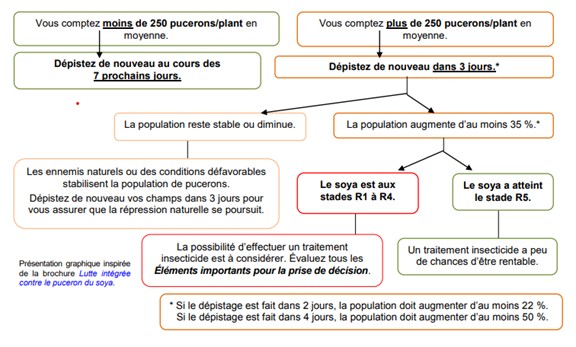 Toutefois, l’atteinte du seuil d’alerte ne signifie pas qu’un traitement insecticide doit être appliqué immédiatement, mais plutôt qu’un dépistage plus soutenu est nécessaire (tous les 3 à 7 jours). Il est primordial de faire au moins deux dépistages avant de prendre la décision d’intervenir afin de s’assurer que la population de pucerons est en augmentation.