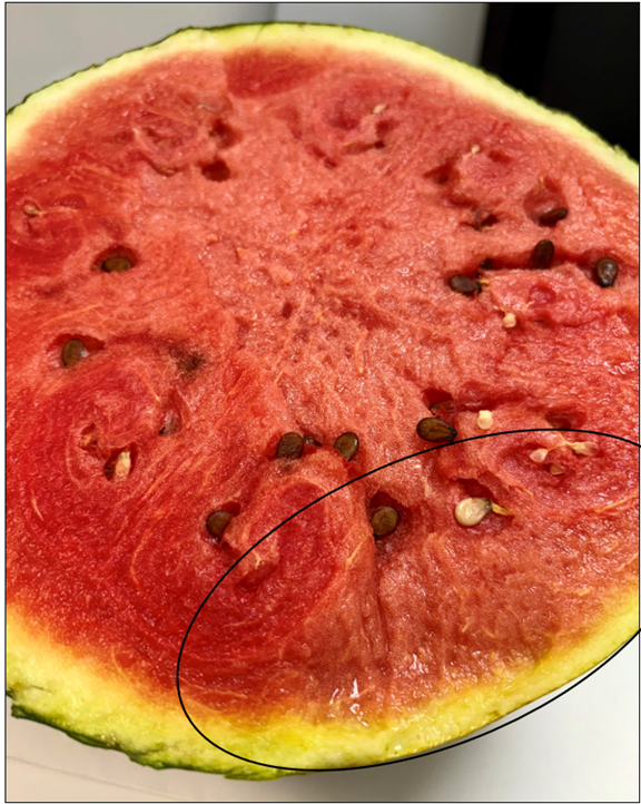Dans le cercle noir, insolation de la partie du fruit exposée au soleil